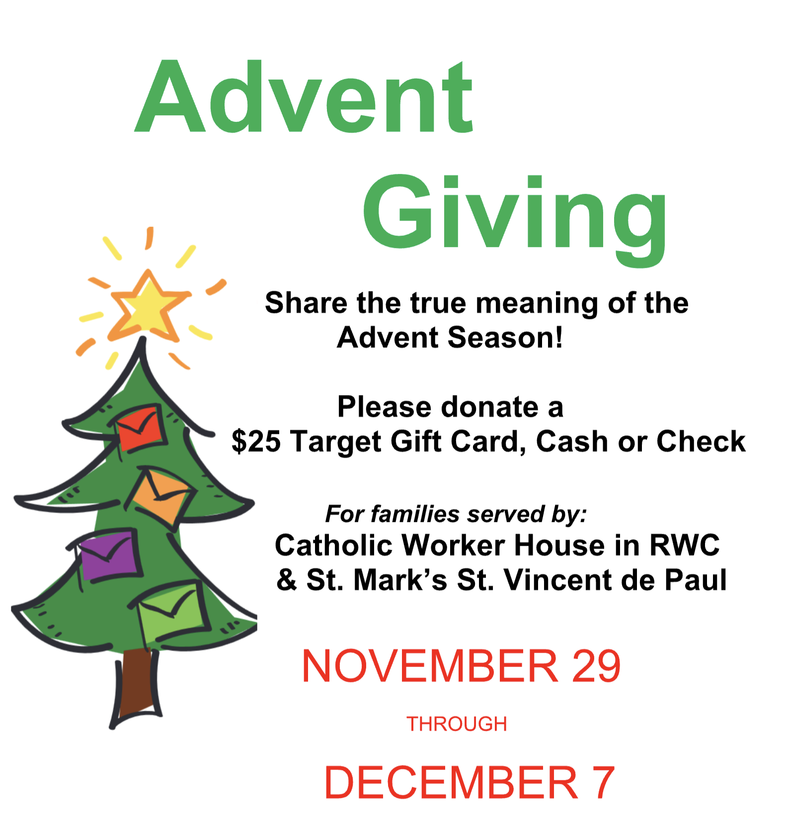 We are requesting $25 Target gift cards; which will be divided between SVdP clients of St. Mark as well as those served by Catholic Worker House, Redwood City. Pick up a return envelope on the table to the left of the altar. Place gift cards in the envelope and return to the same table by the weekend of December 8.