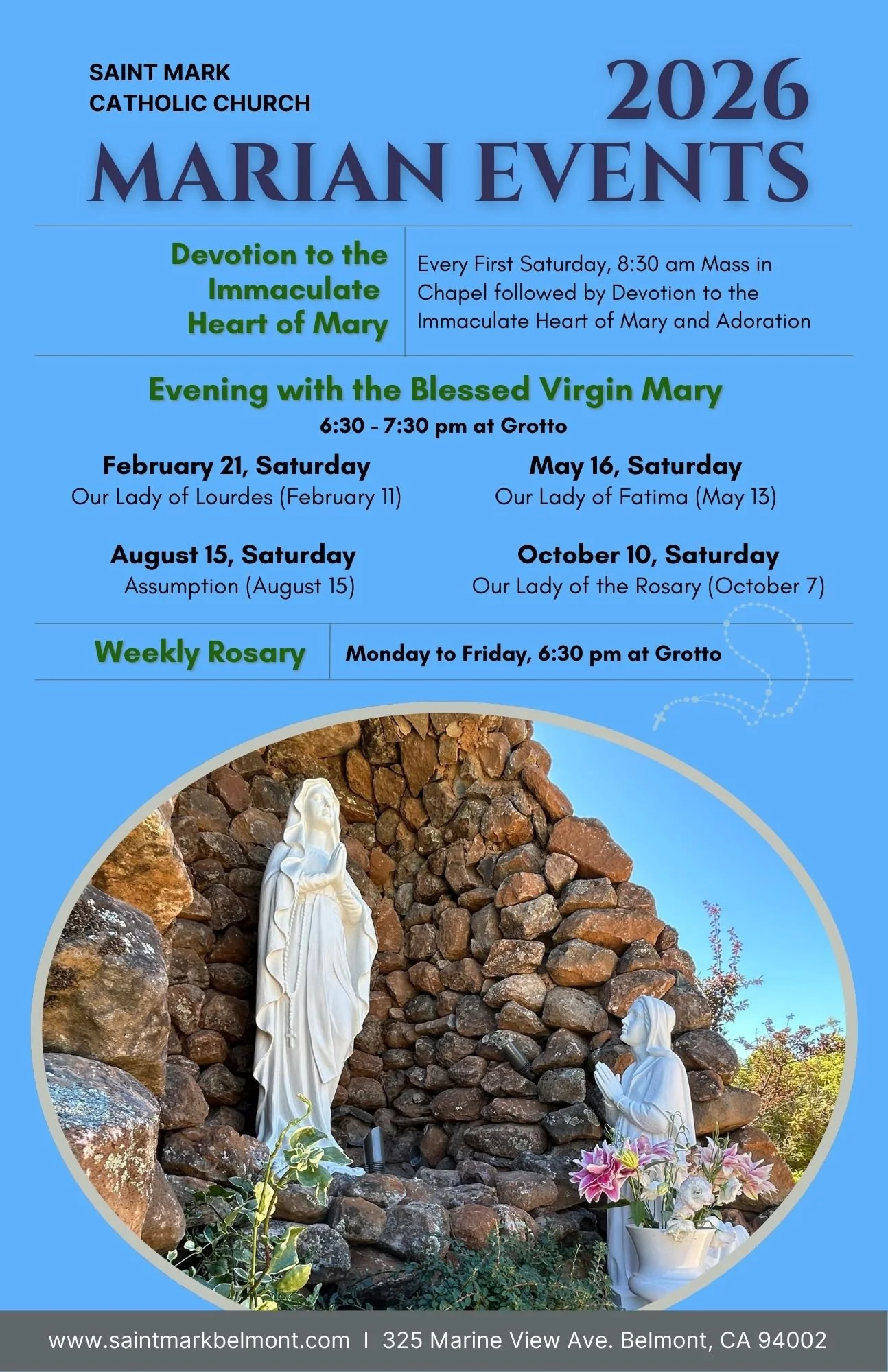 On December 4, 2022, St. Mark parishioners together with clergy and in the presence of Archbishop Salvatore Cordileone, witnessed the unveiling and blessing of the Our Lady of Lourdes Grotto at the parish grounds.